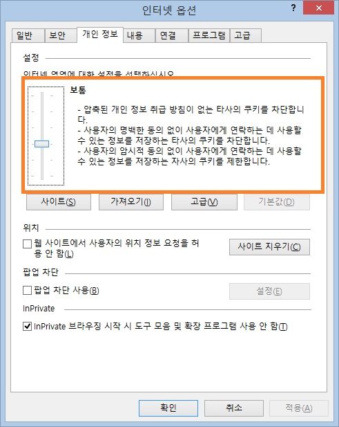 개인정보 탭에서 인터넷 영역에 대한 설정을 보통까지 낮추면 된다.