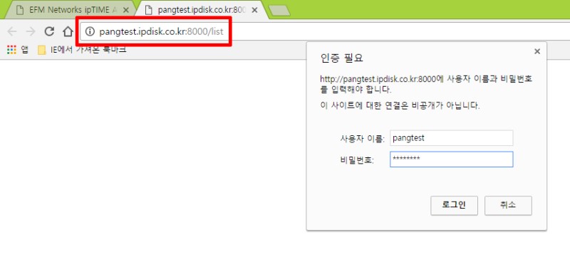 위의 경우는 http://pangtest.ipdisk.co.kr:8000/list 로 접속이 가능.