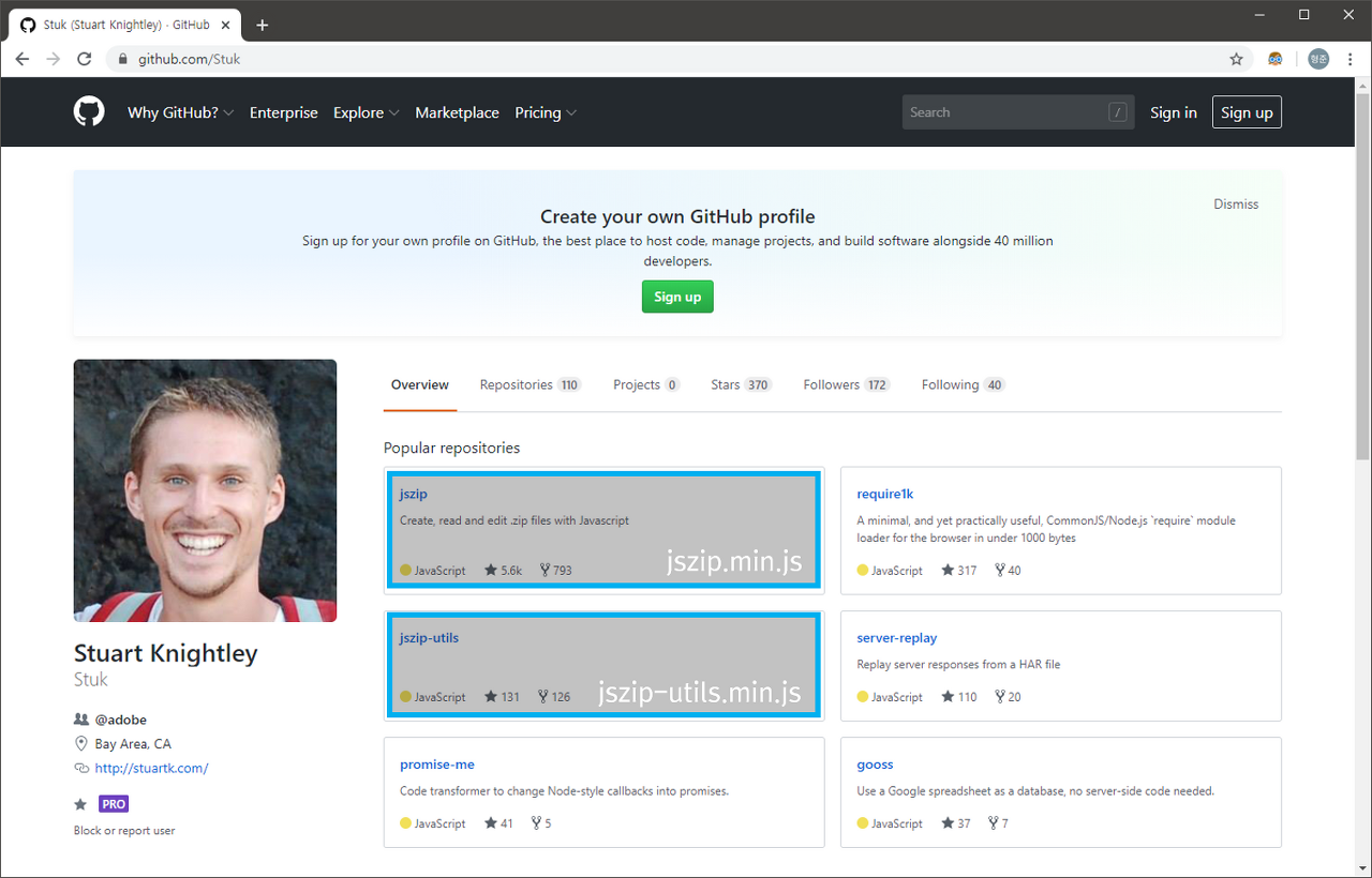 여튼, 여러 개의 파일이 하나로 묶인, 하나의 압축 파일로써 zip을 처리할 수 있는 자바스크립트 기반의 라이브러리가 몇가지 되는데.. 그중 제가 사용한 라이브러리를 소개합니다. 바로 jszip인데요. 아래의 해맑고 환하게 웃는 인상좋은 개발자의 github에 방문해 다운로드 받을 수 있습니다.