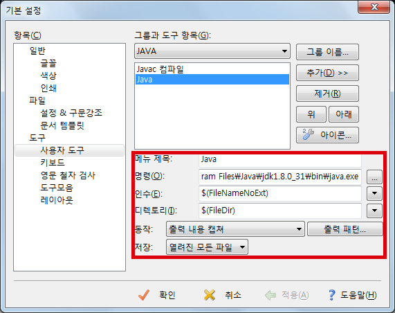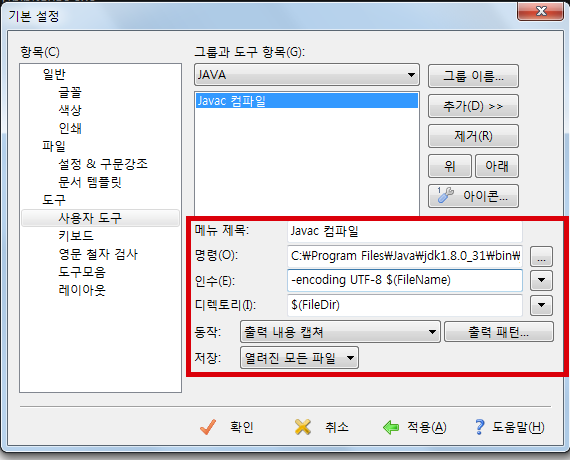 인수 : -encoding UTF-8 $(FileName) ==> 파일 이름 : $(FileName) , -encoding UTF-8은 자바 컴파일 한글 에러 대처하기 추가함