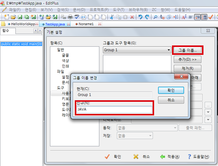 [도구] - [사용자 도구 구성] 에 들어가서 사용자도구에 JAVA라는 새 그룹을 만들어줍니다.