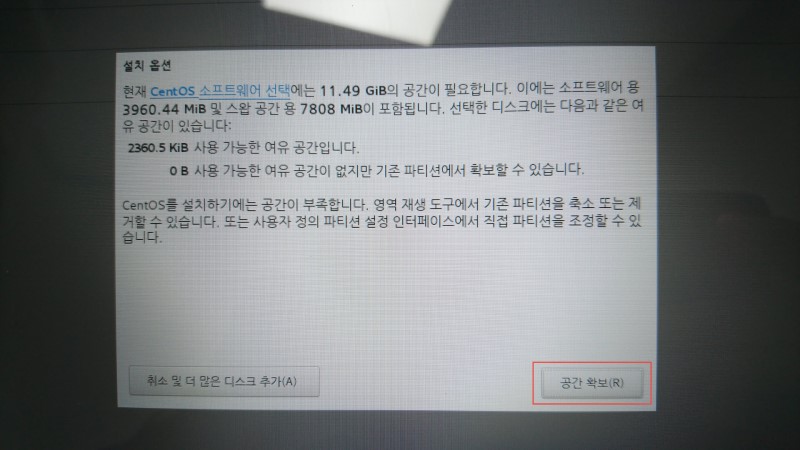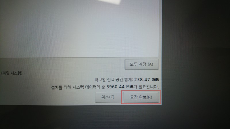선택한 저장장치에 이미 파티션이 설정되어 있거나 공간이 부족할 경우 위와 같은 설치 옵션 안내창이 나옵니다. 여기서는 [공간 확보(R)] 버튼을 누릅니다.