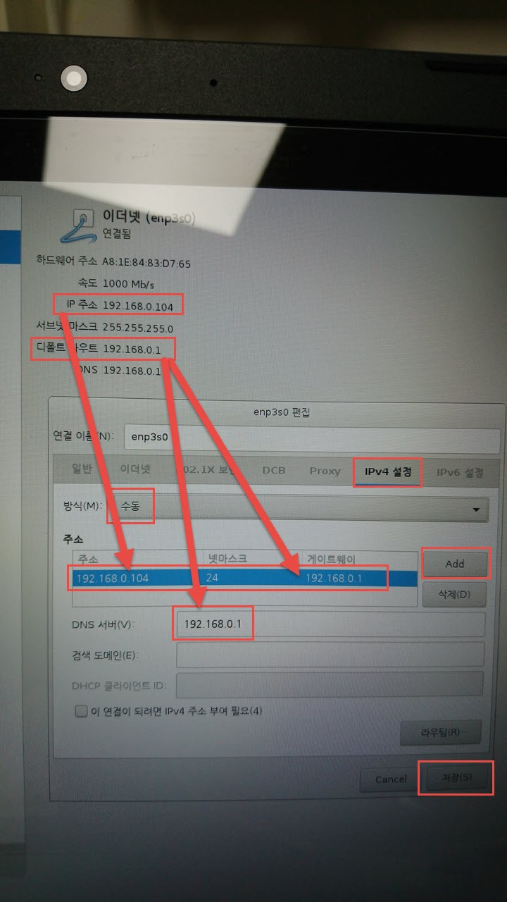 게이트웨이 : 초기에 잡힌 디폴트 라우트 주소를 입력합니다. (예: 192.168.0.1)