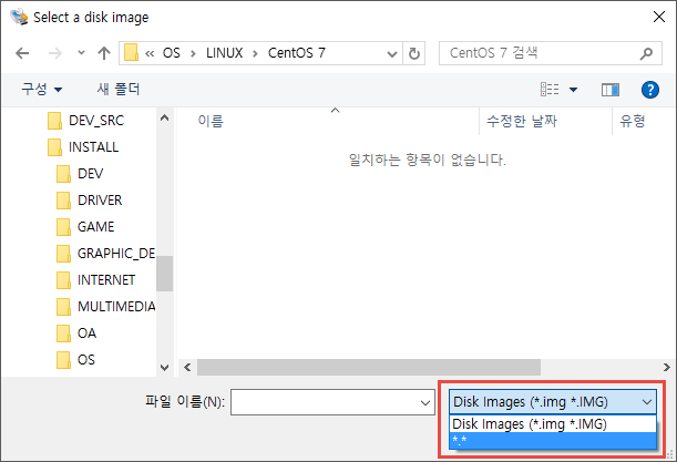 [Select a disk image] 창이 뜨면 위와 같이 파일의 기본 확장자 필터가 Disk Images (*.img *.IMG)로 선택되어 있습니다. 이것을 *.* 목록으로 바꿔줍니다.