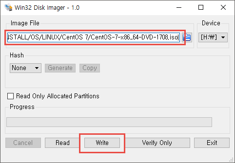 CentOS 7 설치를 위해 SanDisk 64GB USB 메모리 스틱을 사용하였으며, Win32DiskImager 프로그램을 이용하여 CentOS 7 ISO 이미지를 USB 메모리 스틱에 부팅 가능하도록 하였습니다.