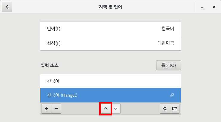 그러면 [한국어 (Hangul)] 항목이 추가된 것을 볼 수 있습니다. 이 항목을 다시 선택하고 [△] 버튼을 눌러 가장 위로 가도록 이동시킵니다.