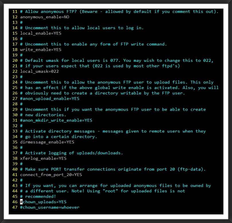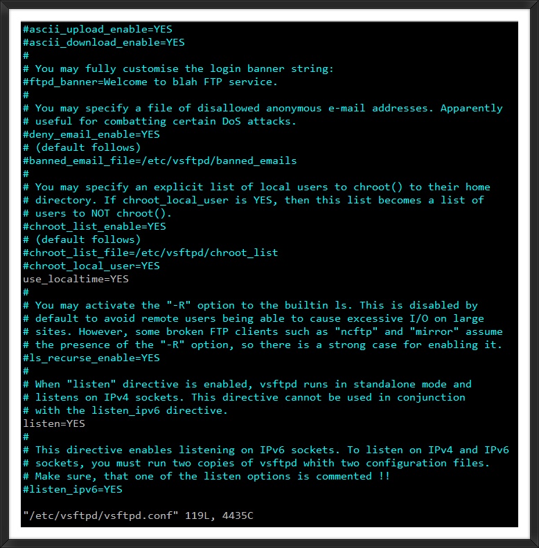 anonymous_enable=NO idle_session_timeout=600 chroot_local_user=NO allow_writeable_chroot=YES chroot_list_enable=YES listen=YES use_localtime=YES anon_max_rate=100000 local_max_rate=500000 force_dot_files=YES max_clients=10 max_per_ip=2