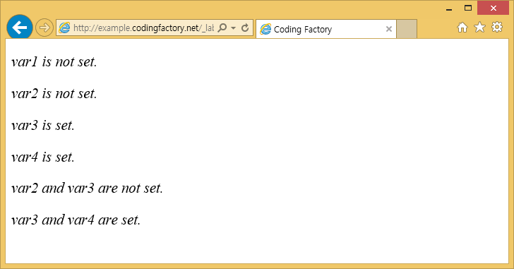 <!doctype html> <html lang="ko"> <head> <meta charset="utf-8"> <title>Coding Factory</title> <style> p { font-family: "Times New Roman"; font-style: italic; font-size: 1.3em; } </style> </head> <body> <?php $var1; $var2 = NULL; $var3 = ""; $var4 = "Lorem"; if ( isset( $var1 ) ) { echo "<p>var1 is set.</p>"; } else { echo "<p>var1 is not set.</p>"; }; if ( isset( $var2 ) ) { echo "<p>var2 is set.</p>"; } else { echo "<p>var2 is not set.</p>"; }; if ( isset( $var3 ) ) { echo "<p>var3 is set.</p>"; } else { echo "<p>var3 is not set.</p>"; }; if ( isset( $var4 ) ) { echo "<p>var4 is set.</p>"; } else { echo "<p>var4 is not set.</p>"; }; if ( isset( $var2, $var3 ) ) { echo "<p>var2 and var3 are set.</p>"; } else { echo "<p>var2 and var3 are not set.</p>"; }; if ( isset( $var3, $var4 ) ) { echo "<p>var3 and var4 are set.</p>"; } else { echo "<p>var3 and var4 are not set.</p>"; }; ?> </body> </html> |