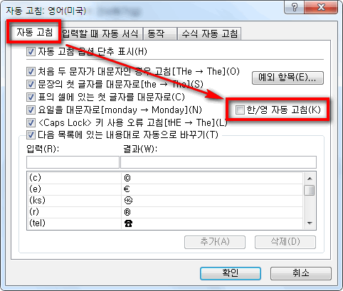 - 자동 고침 옵션 화면에서 [자동 고침] 클릭, [한/영 자동 고침] 체크를 해제 하세요. [확인]을 클릭하여 옵션 화면을 닫으면 적용됩니다.