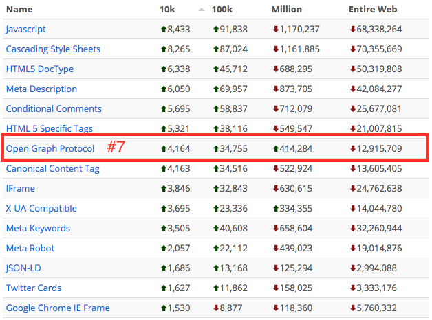 오픈그래프는 웹의 세계에서 아주 높은 위상을 가지고 있습니다. 오늘날 웹페이지들이 어떤 기술을 가지고 만들어졌는지를 분석해주는 사이트 builtwith의 통계에 따르면 오픈그래프는 웹문서를 이루고 있는 여러 기술들 중에서 상당히 상위권에 포진하고 있습니다.