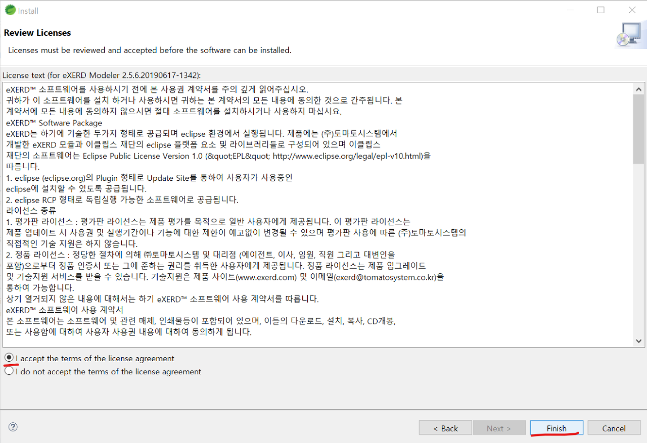 동의함에 체크하고 Finish를 클릭합니다.