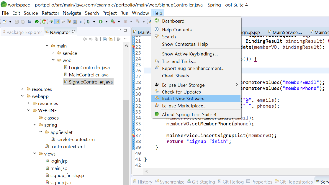 Help 탭에서 Install New Software를 클릭합니다.