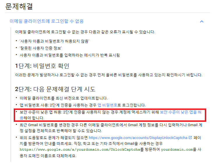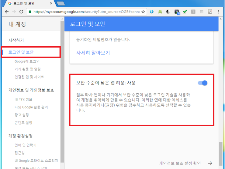 - 지메일(Gmail) 계정 액세스 불허 (아래 이미지 붉은 박스 참조)