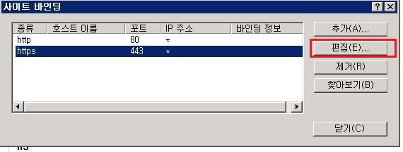 2. iis관리자>사이트>도매인선택>바인딩>https>편집>1번에서 가져온 ssl인증서선택