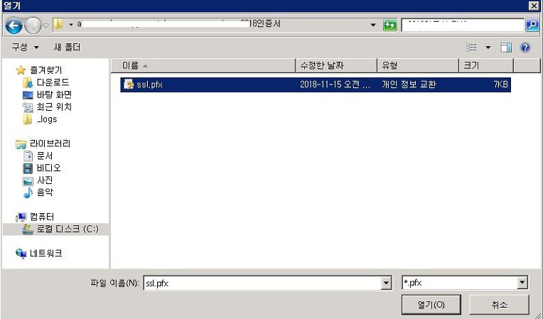 "인증서" 를 클릭하여 ssl.pfx 파일을 다운로드한다.