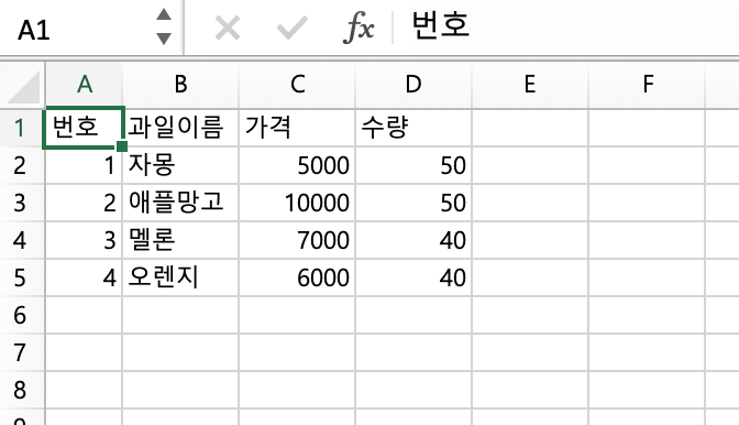 // 헤더 행 생 Row headerRow = sheet.createRow(0); // 해당 행의 첫번째 열 셀 생성 Cell headerCell = headerRow.createCell(0); headerCell.setCellValue("번호"); // 해당 행의 두번째 열 셀 생성 headerCell = headerRow.createCell(1); headerCell.setCellValue("과일이름"); // 해당 행의 세번째 열 셀 생성 headerCell = headerRow.createCell(2); headerCell.setCellValue("가격"); // 해당 행의 네번째 열 셀 생성 headerCell = headerRow.createCell(3); headerCell.setCellValue("수량");
