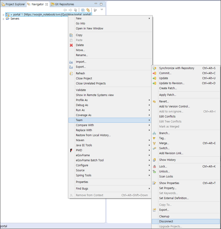 이클립스에 svn이 연결돼 있는데 그 연결을 끊는 방법입니다.