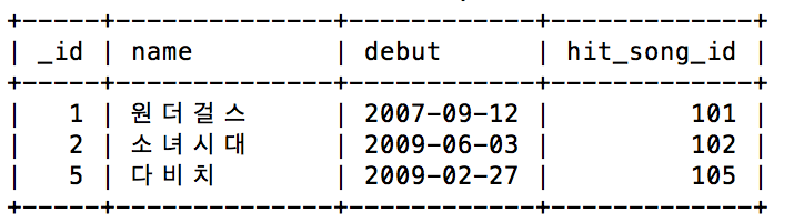 | VALUES ('원더걸스', '2007-09-12', 101); |