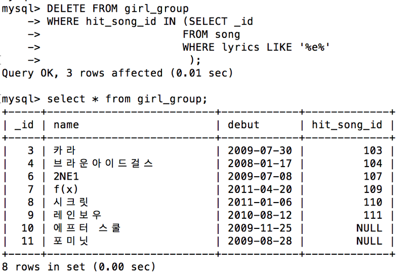 위 쿼리를 싱행하면 가사에 'e' 문자를 포함 하는 노래를 히트곡으로 하는 걸그룹이 삭제가 된다.