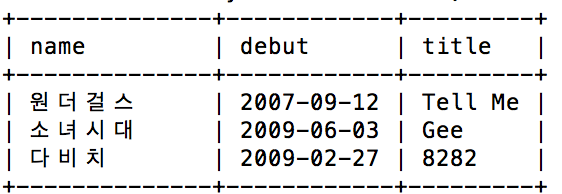 | VALUES ('소녀시대', '2009-06-03', 102); |