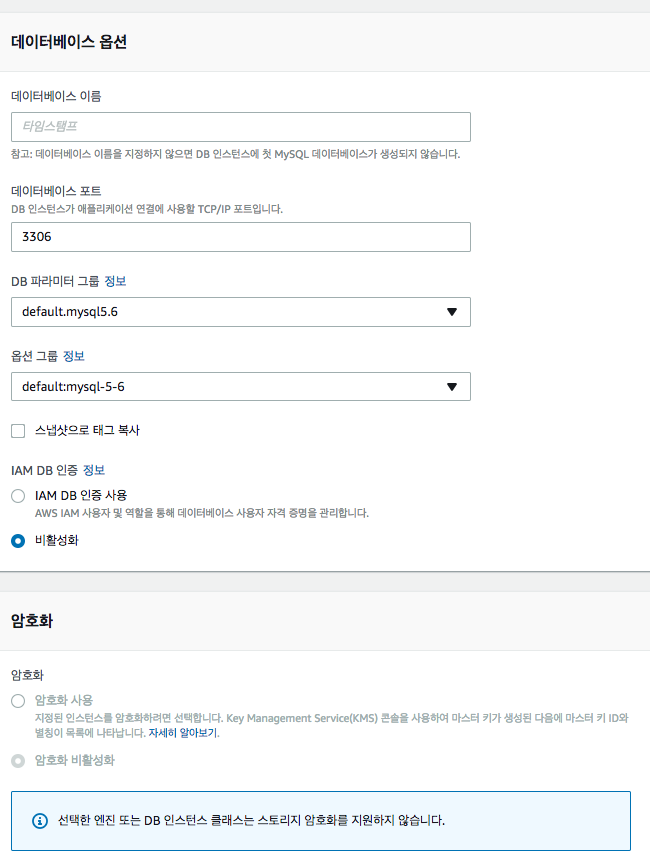 - Option Group : default:mysql-5-6 (기본값 그대로 사용)