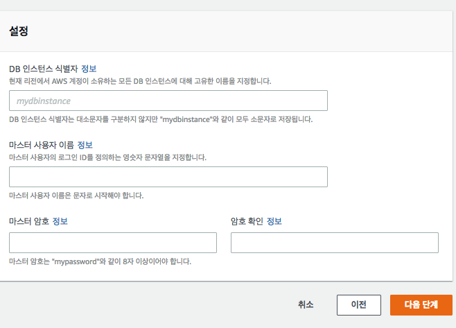 - Master Username : 관리자유저네임 (DBMS 관리자 UserNAME)
