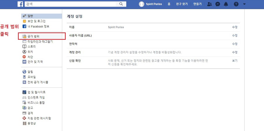 좌측 메뉴에서 공개 범위를 클릭합니다.