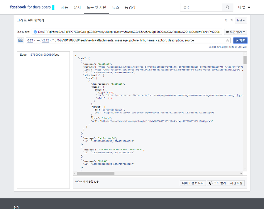 형태로 입력하면 내가 게시한 페이스북 글 데이터들을 얻을 수 있습니다.