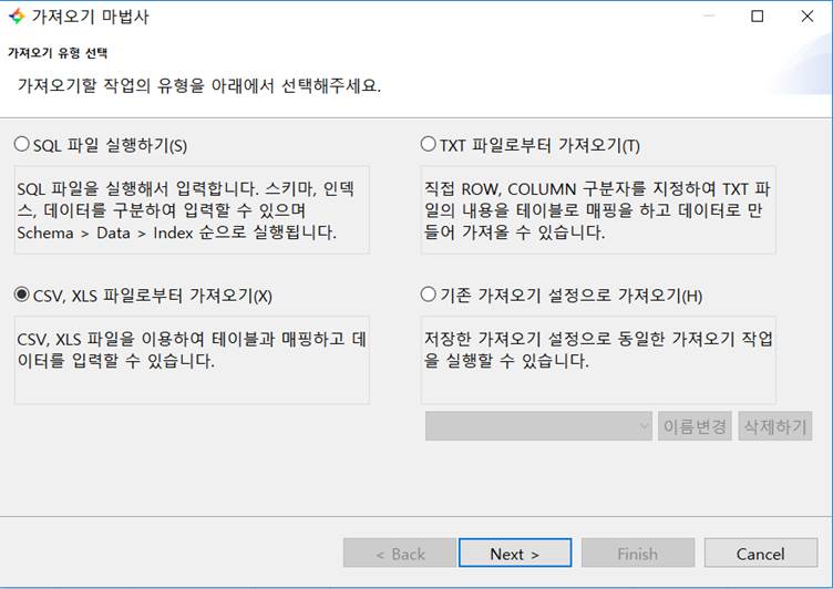 (스키마는 SQL 파일만 지원하며, 데이터는 SQL, CSV, XLS, TXT를 지원합니다.)