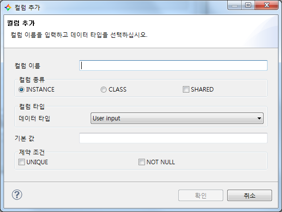 [그림 3]의 컬럼 추가 메뉴에서 새로 생성하고자 하는 컬럼 이름, 컬럼 타입, 컬럼 길이, 제약 조건을 명시한다.