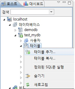 [그림 1]과 같이 []localhost > 데이터베이스 > demodb > 테이블] 항목을 우클릭한 후 팝업되는 메뉴에서 [테이블 추가]를 선택한다.