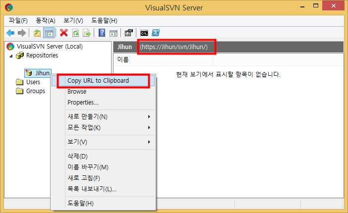 만들어진 저장소이름에 [우클릭] 한다음 Copy URL to Clipboard를 클릭하시면
