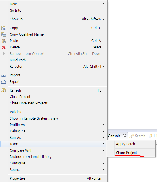 1. 프로젝트를 우 클릭하여 Team - Share Project 를 클릭한다.