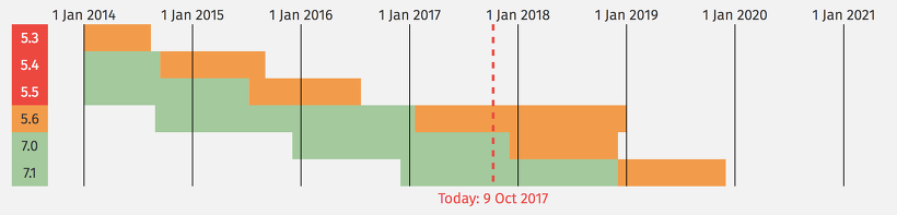 위의 사진은 PHP의 버전별로 지원 그래프입니다. 주황색으로 표기된 영역은 보안 지원기간입니다.