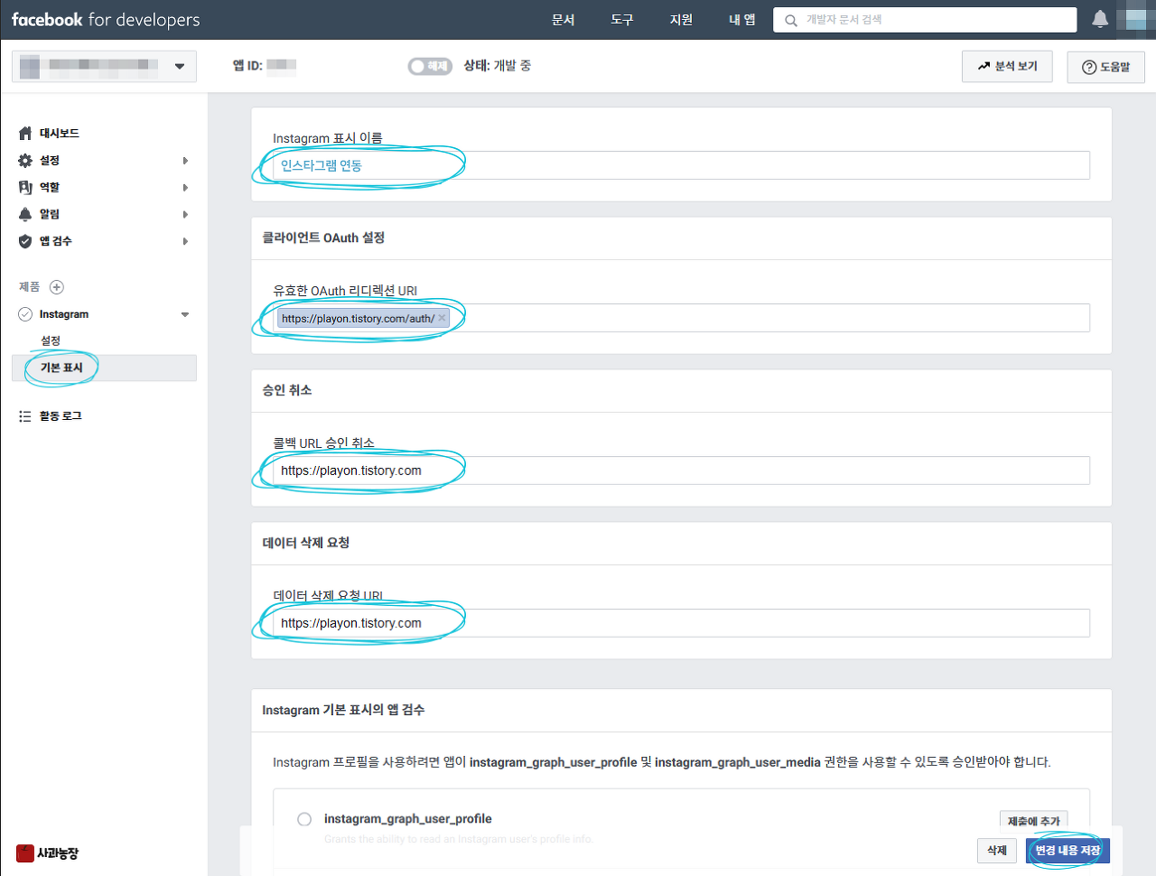 하단에 "Instagram 기본 표시의 앱 검수" 안해도 됨