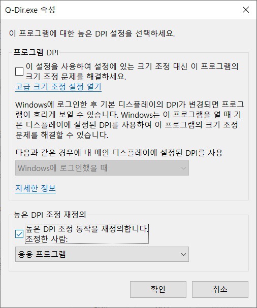 높은 DPI 설정 변경 창에서 하단부에 있는 "높은 DPI 조정 동작을 재정의합니다" 를 클릭한 다음 아래 콤보 박스는 기본인 "응용 프로그램" 을 선택 합니다.