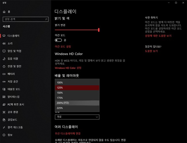 그래서 인지 윈도우10 에서도 고해상도를 위해 배율 조정을 할수 있습니다. 한다디로 해상도는 그대로 두고 화면을 확대한다는 것이죠. 고해상도의 경우 윈도우에서 자동으로 어느 배율이 적합한지를 판단해 권장 표시도 해주고 있죠.