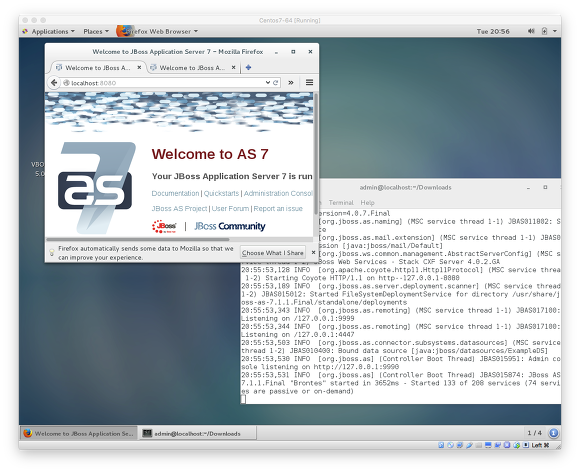 위 화면과 같이 CentOS 내부 브라우저에서 localhost:8080으로 접속했을 때 'Welcome to AS 7' 화면이 나타나면 성공이다.