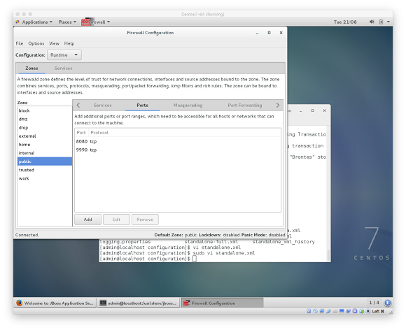 ## JBOSS의 기본 설정 포트인 8080과 관리포트인 9990 오픈 [admon@localhost ~] $ firewall-cmd --permanent --zone=public --add-port=8080/tcp [admon@localhost ~] $ firewall-cmd --permanent --zone=public --add-port=9990/tcp