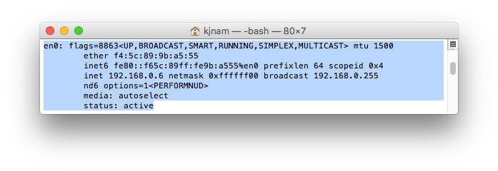 이제 Jboss와 CentOS의 설정은 마쳤고, Virtual Box 에서 포트포워딩 설정이 필요하다. 먼저 호스트 피씨 (Virtual Box를 실행시킨) 에서 Virtual Box에 할당된 ip 주소를 확인한다. (맥의 경우 터미널에서 ifconfig / 윈도우의 경우 cmd에서 ipconfig)