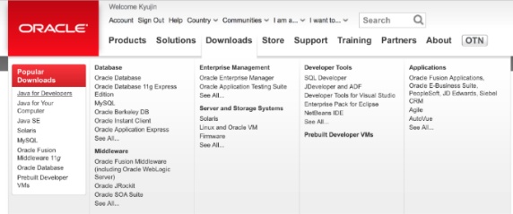 CentOS의 웹 브라우저에서 oracle.com 에 로그인 후 위 캡쳐화면과 같이 Downloads > Java for Developers 로 이동한다.