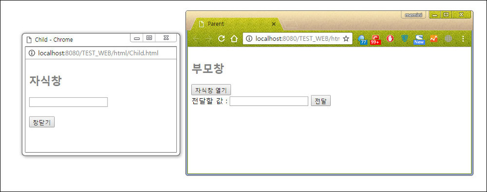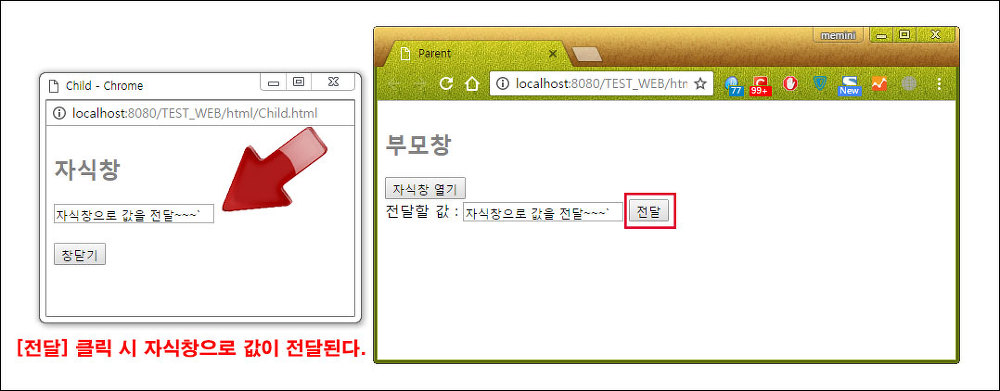 자식창이 열리면 부모창에서 전달할 값을 입력 후 전달 버튼을 클릭한다. 그러면 입력한 값이 자식창으로 전달된다.