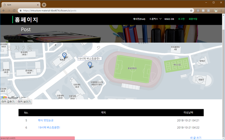 다음지도 API에서 자동으로 알아낸 후, 좌표값의 정보가 담긴 Scaffold 게시글을 등록하면 메인 홈페이지 등에 보여지는 지도에 모든 좌표가 보여지게 하는 원리의 지도를 소개하고자 합니다.