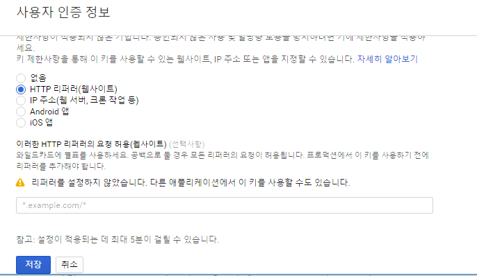 특정사이트나 주소에만 동작하게 하려면 '키 제한하기'를 눌러 아래와같이 진행하시면 됩니다.
