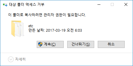 덮어쓰기를 실행하면 관리자 권한이 필요하다고 나옵니다. 이 작업은 관리자 권한이 있는 계정으로 하여야 합니다. 계속을 누르면 복사가 되어 집니다.