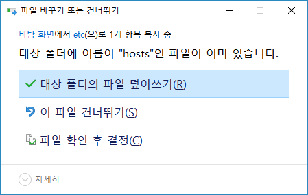 이럴경우 hosts 파일을 다른 폴더로 복사를 해서 수정을 합니다. 수정후 수정된 파일을 원래의 위치로 다시 복사를 해서 덮어쓰게 됩니다.