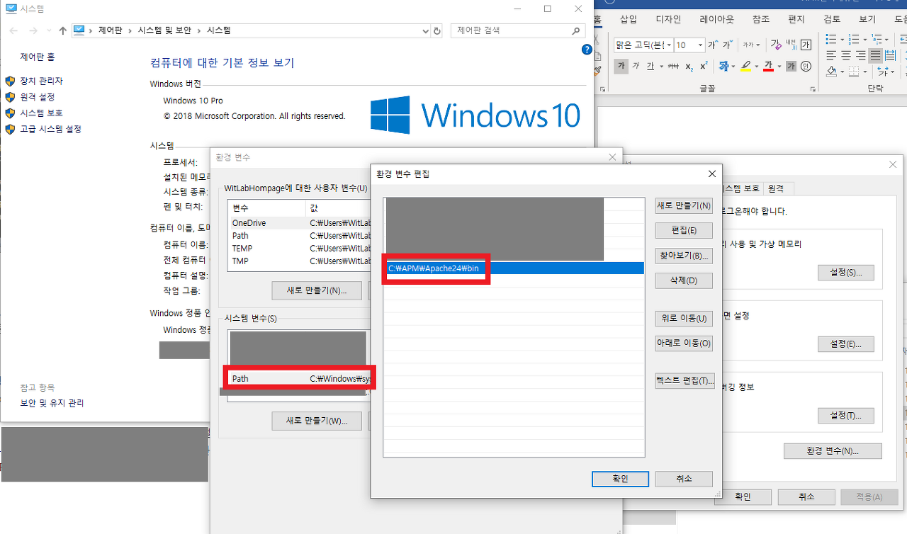 시스템변수 – Path 항목에 /bin (“C:/APM/Apache24/bin”) 추가