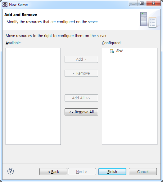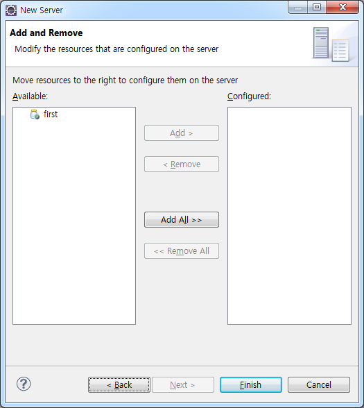 이와 같은 화면이 나온다. 여기에서는 first라는 프로젝트 하나밖에 없기 때문에 상관없지만, 프로젝트가 여러개가 존재할 경우, 그 모든 프로젝트의 목록이 나온다. first를 더블클릭하거나 Add > 버튼을 눌러서 Configured 쪽으로 옮기고 Finish를 누른다.