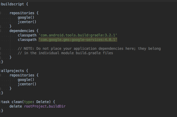 classpath 'com.android.tools.build:gradle:3.2.1' classpath 'com.google.gms:google-services:4.0.1'