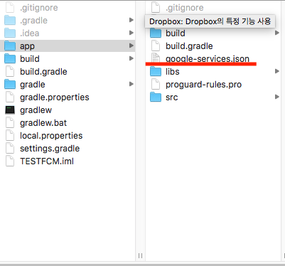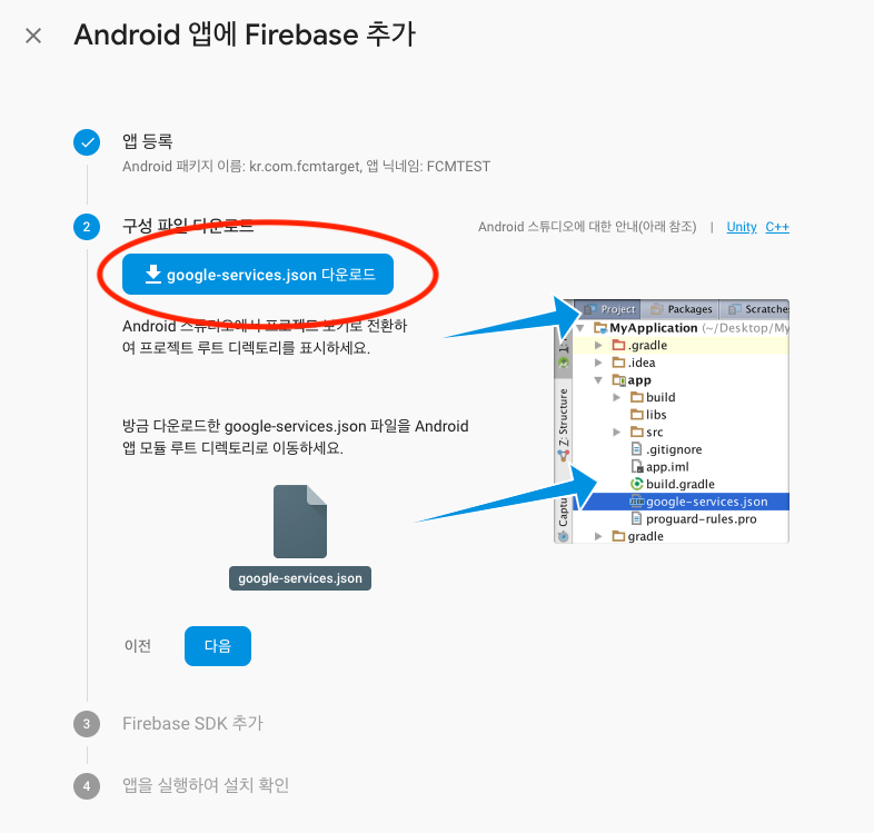 위의 스크린샷에서 처럼 google-service.json 파일을 다운받은 뒤 현재 FCM사용을 위해